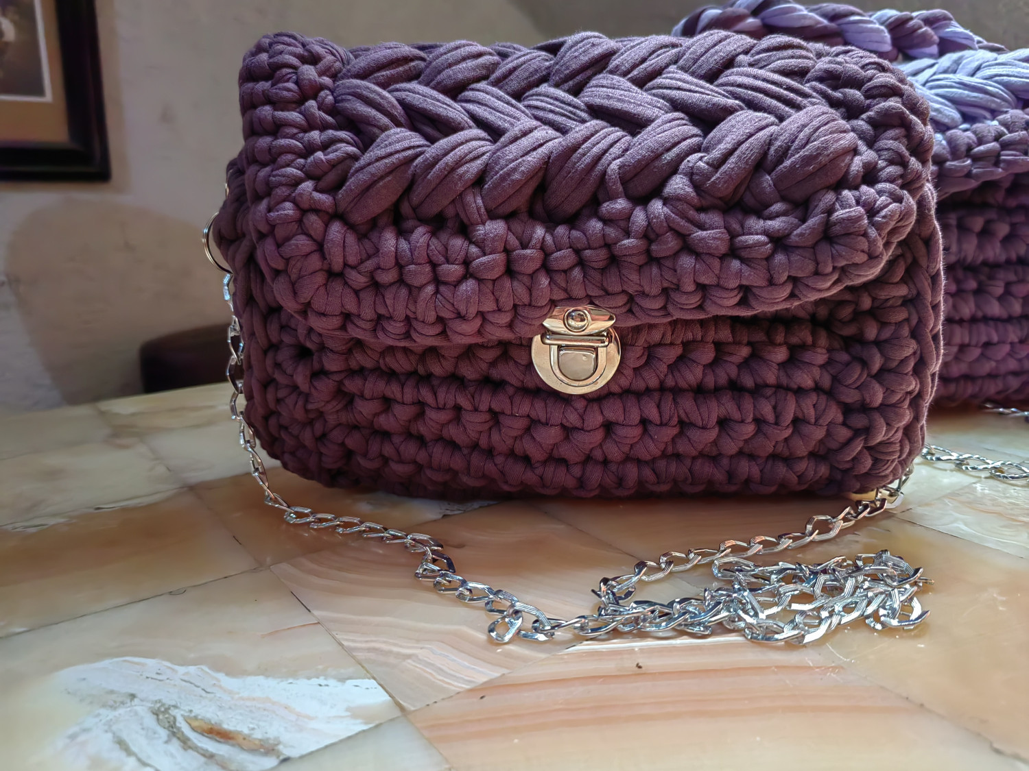 Bolsa artesanal tejido a mano en trapillo color morado oscuro, diseño compacto y rectangular. Cuenta con un broche metalico en tono plateado y una cadena metalica. Combina un estilo rustico y a la ves elegante, ideal para uso casual o como accesorio distintivo en un look mas sofisticado.