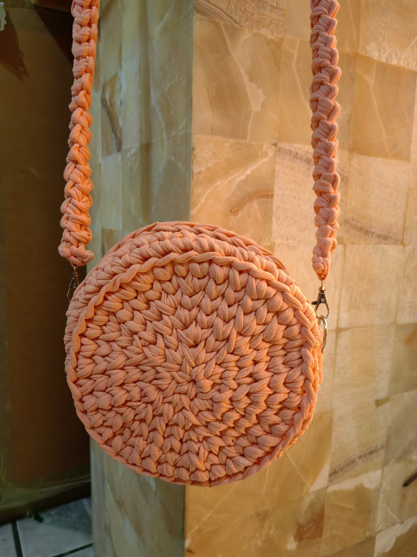 Bolsa de trapillo echa a crochet con algunos accesorios extra. Su tamaño aproximado es de 20 cm de diámetro x 8 cm de ancho, con una cadena de 1 metro de largo. Se puede realizar en cualquier color en existencia bajo pedido en cualquier color.