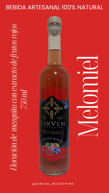 Bebida fermentada a base de miel de floración de mezquite con extracto de frutos rojos. 100% natural.